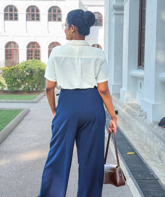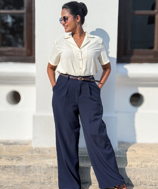 Effortlessly refined and designed for the modern working woman, this elegant cream shirt paired with tailored navy wide-leg trousers brings together timeless style and everyday comfort. Crafted to enhance confidence and ease, the soft, breathable fabric drapes beautifully while maintaining a polished, structured silhouette.